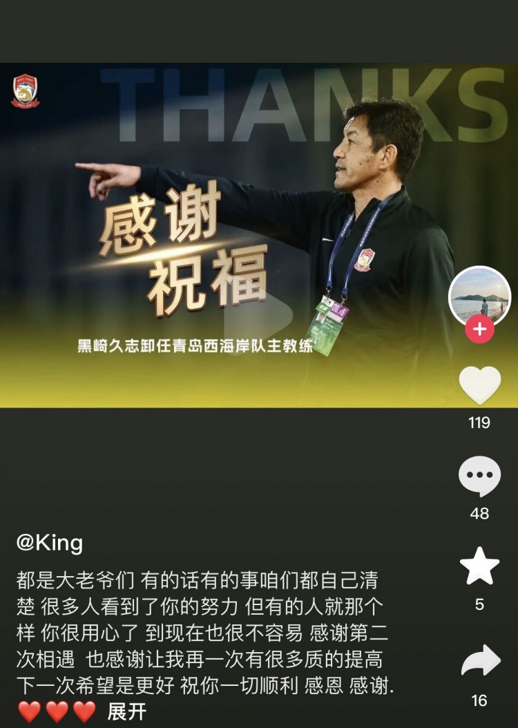 青岛西海岸球员宋博为祝福黑崎久志:你很用心了,但有的人就那样