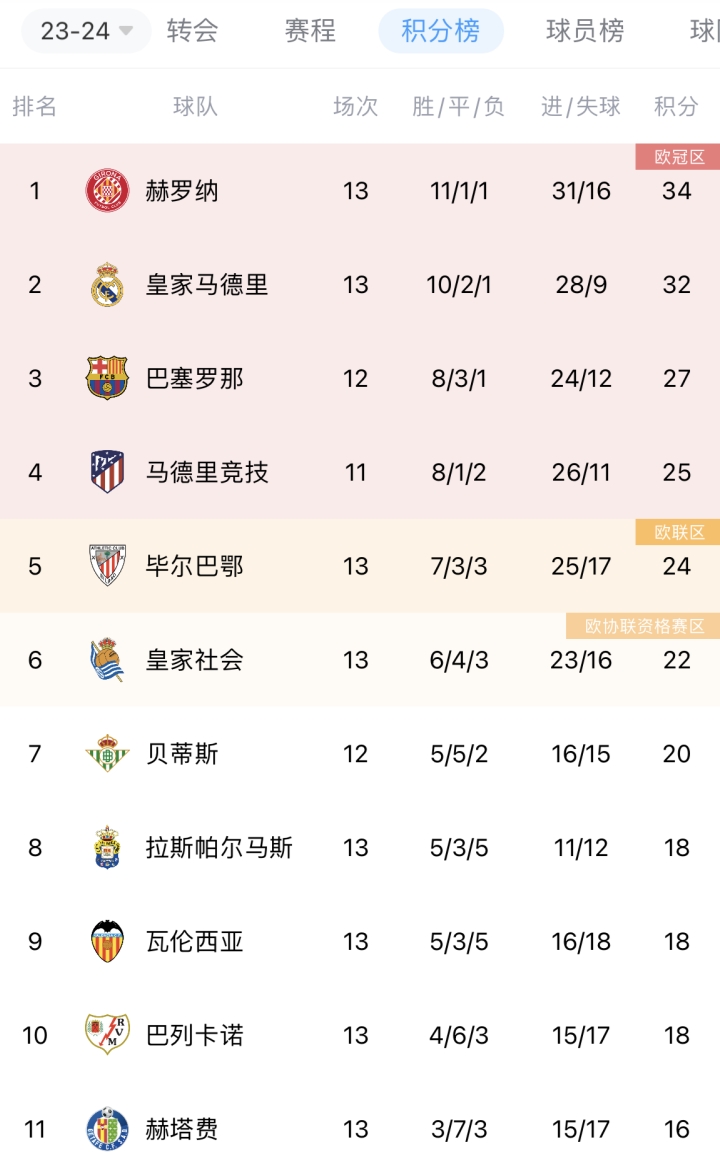 西甲积分:赫罗纳34分第一皇马32分第二,巴萨少赛1场27分第三