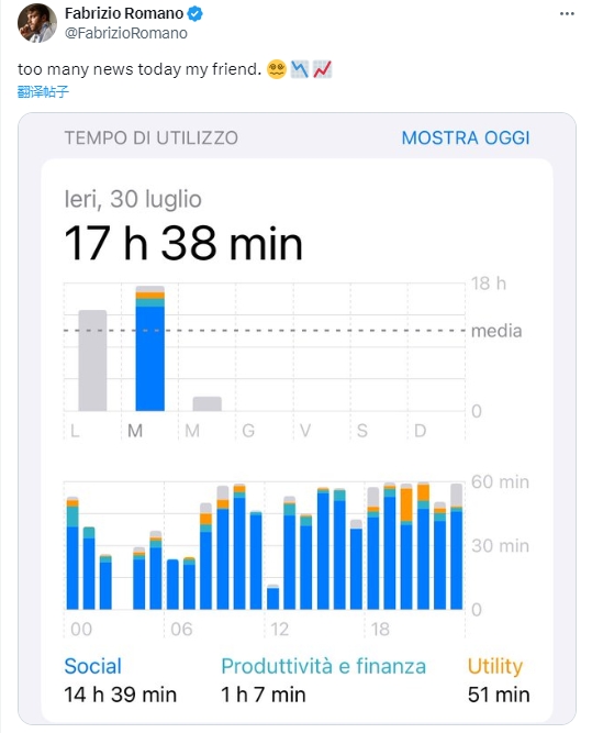 有网友劝罗马诺早点睡觉,这位意大利记者社媒晒出自己今日使用手机的时长——17小时38分钟,其中社媒软件使用时间14小时39分钟,罗马诺配文:“今天新闻太多了,我的朋友。”