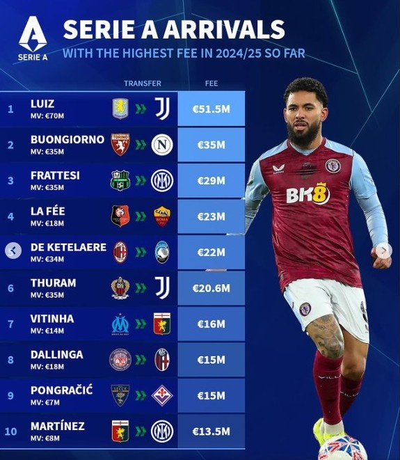 德转列意甲今夏引援榜:D-路易斯居首,弗拉泰西、德凯特拉雷在列