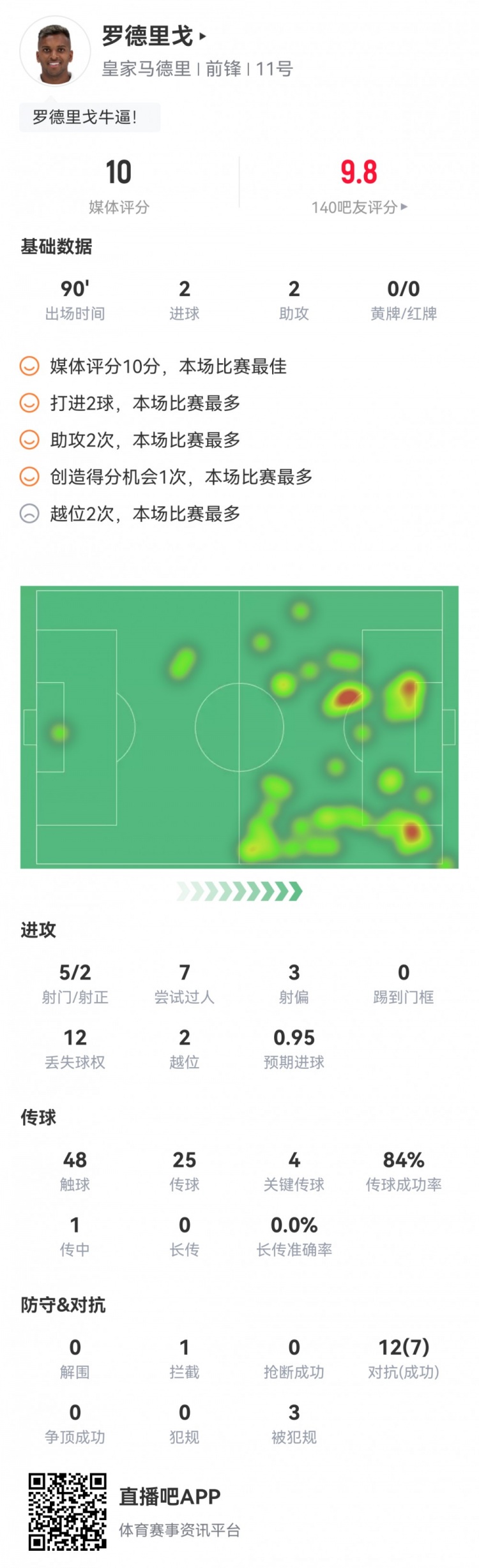 满分表现!罗德里戈本场数据:2射2传造四球,获评满分10分