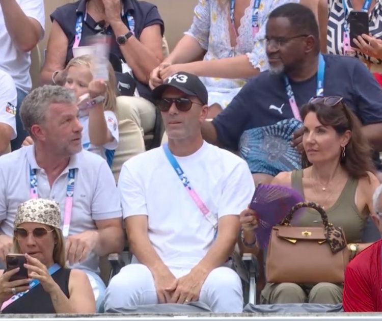 在观众席上,法国传奇球星齐达内现场观战。本届奥运会开幕式,齐达内作为火炬手亮相,并将火炬交给了纳达尔。