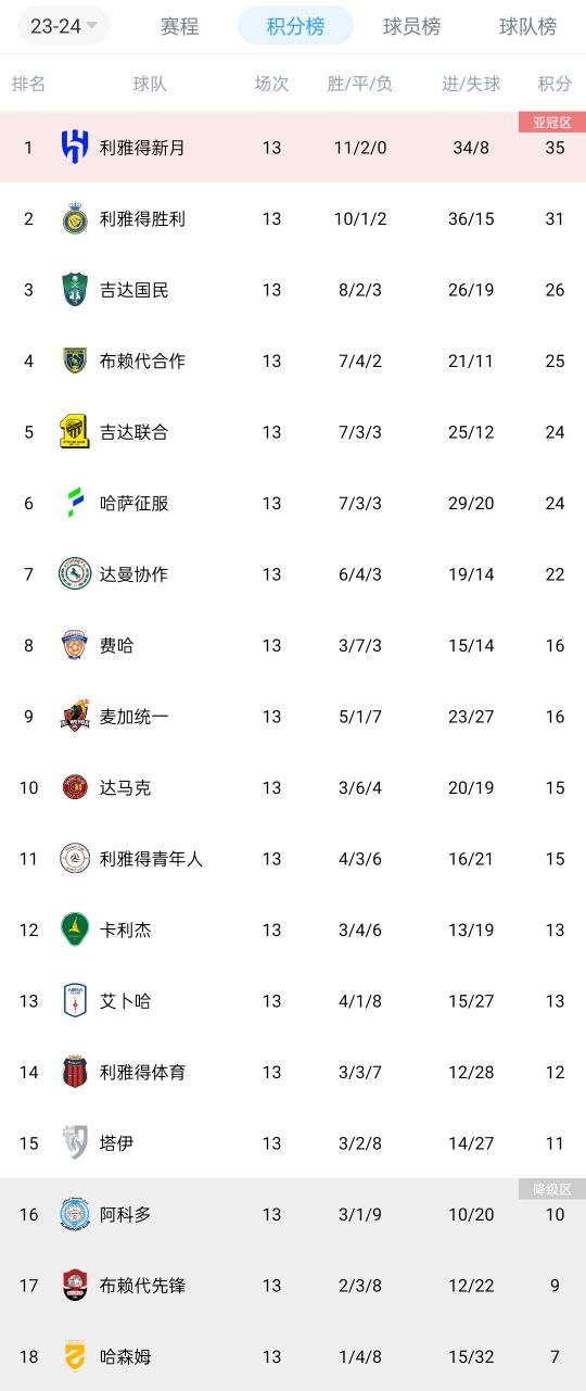 沙特联积分榜,利雅得新月13轮11胜2平不败领跑,利雅得胜利10胜1平2负排第二,距榜首4分。