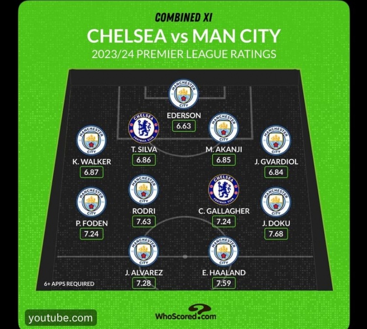 WhoScored评曼城+切尔西最佳阵:蓝军仅弟媳和加拉格尔入选