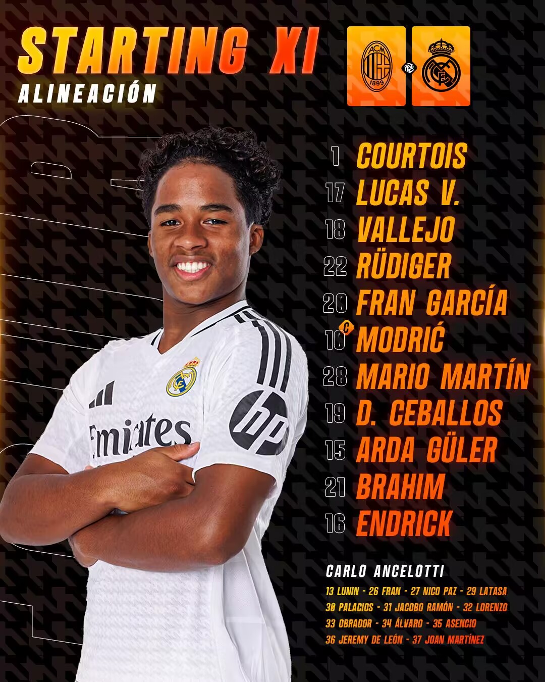 皇马替补:13-卢宁、26-弗兰-冈萨雷斯、27-尼科-帕兹、29-拉塔萨、30-帕拉西奥斯、31-雅各布-拉蒙、32-洛伦佐、33-奥布拉多尔、34-阿尔瓦罗-罗德里格斯、35-阿森乔、36-杰里米-德莱昂、37-若安-马丁内斯