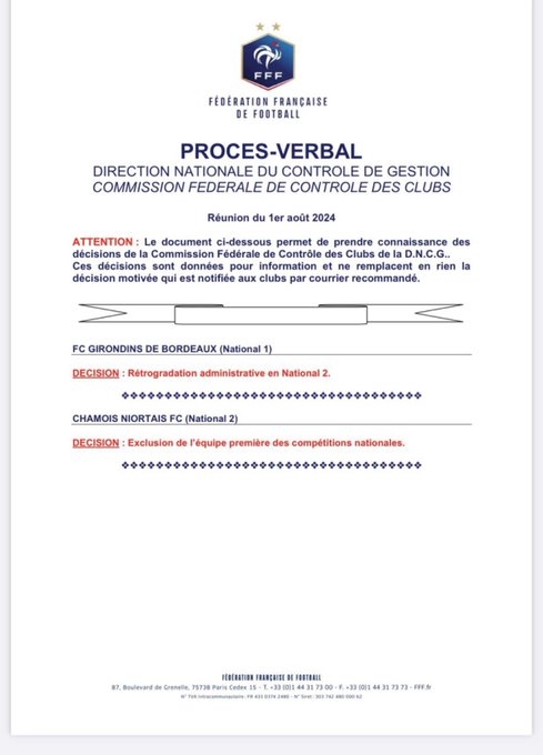 法国足协旗下的DNCG联邦俱乐部控制委员会宣布,波尔多将降级至法国第4级别联赛。
