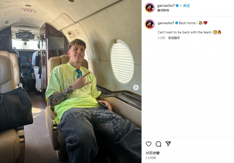 8月2日讯 曼联边锋加纳乔在今日通过社媒晒出自己乘坐飞机抵达曼彻斯特的动态。