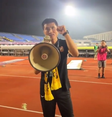 8月3日讯 中超联赛第21轮,青岛西海岸主场1-1战平沧州雄狮。赛后,青岛西海岸新任主帅邵佳一与球迷互动。邵佳一对现场球迷喊话:“所有的人都拼到抽筋了,感谢你