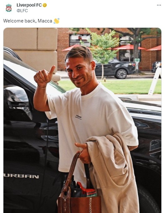 而利物浦官推则晒出了麦卡利斯特的照片,并表示:“欢迎回归,麦卡。”