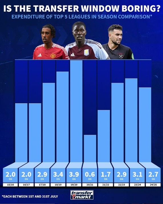 最无趣夏窗?德转对比近10年成交额:今夏第六 2020无悬念垫底
