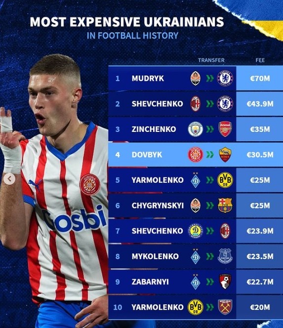 8月3日讯 罗马已经官宣签下赫罗纳中锋多夫比克,《转会市场》数据统计显示多夫比克转会费位列乌克兰球员历史第4位。
