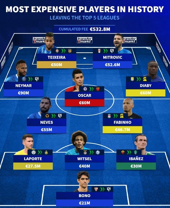德转列非五大联赛历史最贵引援阵:沙特联8将 奥斯卡、特谢拉在列