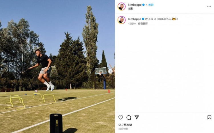 姆巴佩晒出了自己在法国训练的照片,可以看到他正在进行身体训练,他也配文道:“努力中……