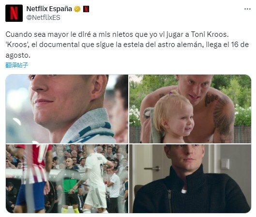 西班牙网飞发布的预告内容为:“当我老了以后,我会告诉自己的孙子孙女,我看过克罗斯踢球。描述这位德国球星的纪录片《克罗斯》将于8月16日上线。”