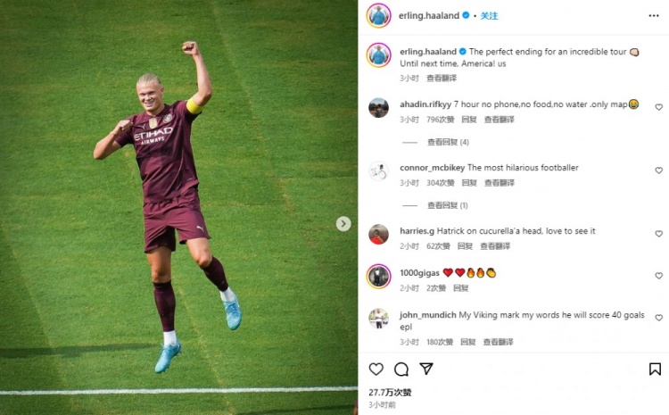8月5日讯 曼城在今日的美国热身赛4-2击败切尔西,哈兰德上演帽子戏法。他也通过社媒晒出自己的庆祝照,并配文:“一次令人难以置信的旅程画上了圆满句号。美国,