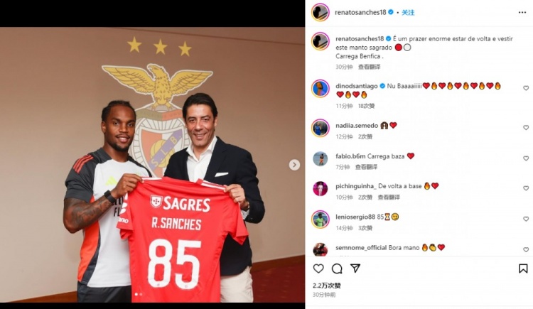 8月6日讯 本菲卡已经官宣租借巴黎中场桑谢斯,这位曾经的金童奖得主也通过社媒纪念重返母队。桑谢斯晒出自己手持本菲卡85号球衣的照片,并配文:“很高兴能够回