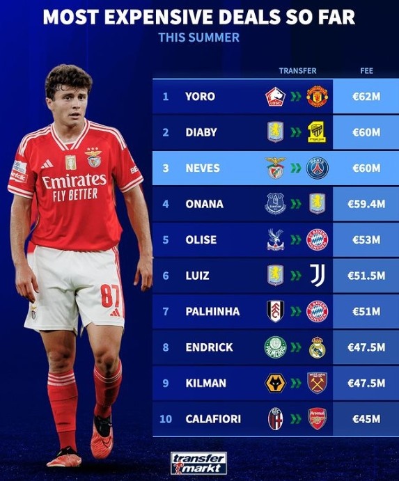 8月6日讯 巴黎已经官宣签下本菲卡后腰若昂-内维斯,《转会市场》也更新了今夏引援转会费榜情况。