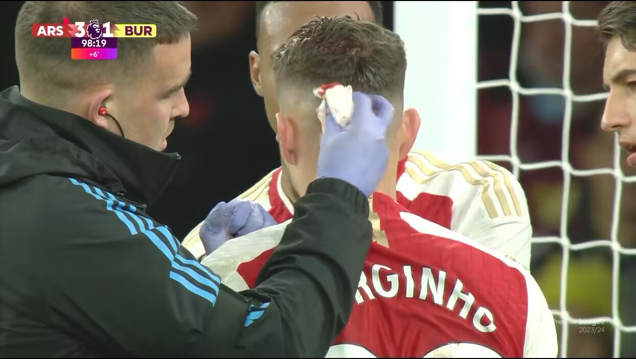 11月12日讯 阿森纳vs伯恩利补时最后阶段,若日尼奥头部被踢,倒地后队医入场长时间处理。镜头可见若日尼奥头部有血迹!