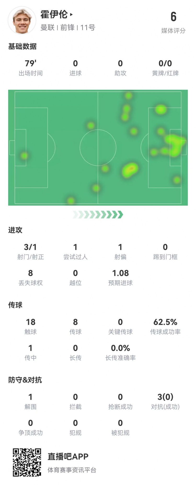 11月12日讯 英超第12轮曼联1-0战胜卢顿,霍伊伦出战79分钟后伤退,本场错失1次良机,3次射门1次射正,预期进球1.08,评分6分。