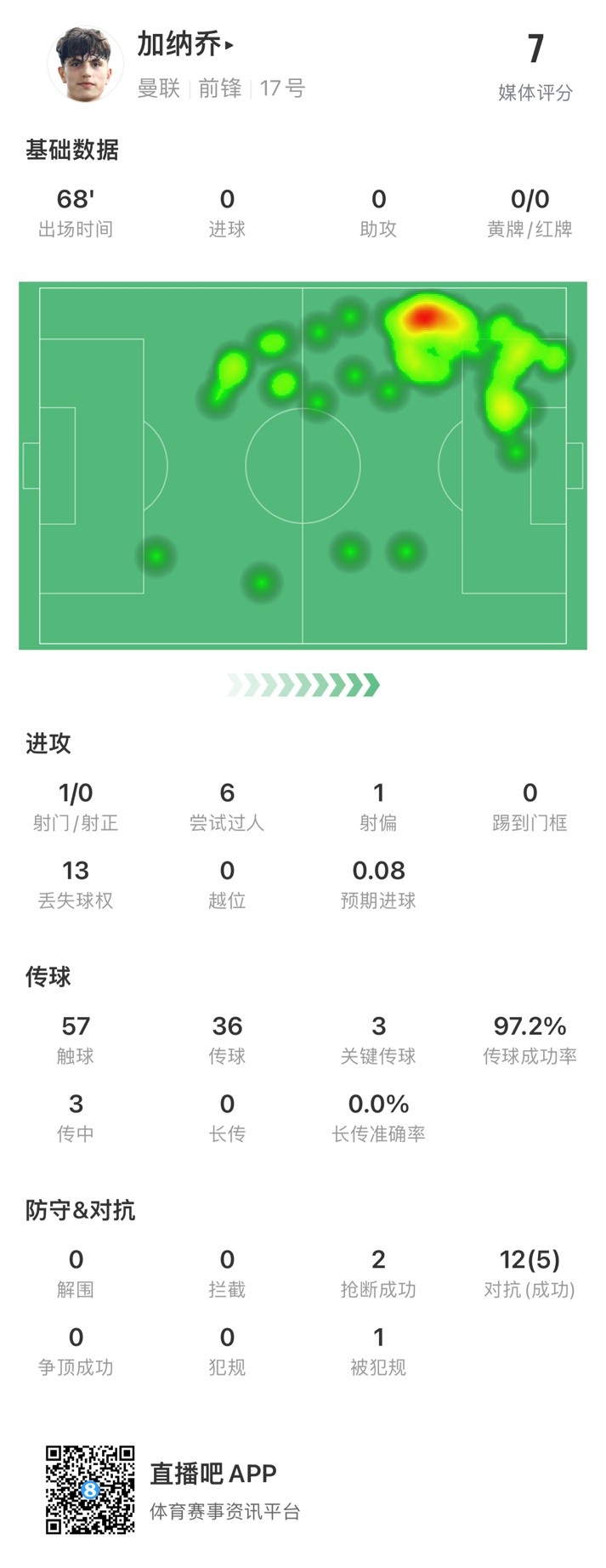 加纳乔本场数据:6次尝试过人,13次丢失球权,3次关键传球