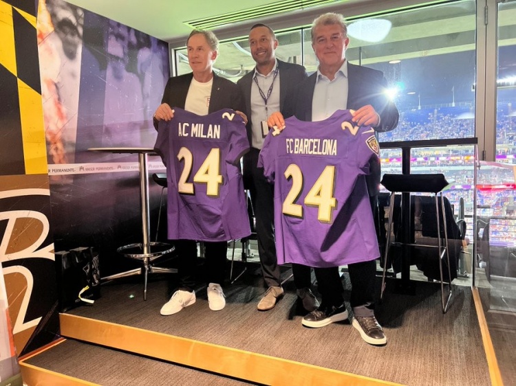 目前,巴萨和AC米兰正在巴尔的摩乌鸦队的主场M&T银行球场进行热身赛。拉波尔塔与AC米兰的名誉副主席以及巴尔的摩乌鸦的主席Ravens Sashi Brown进行了合影。