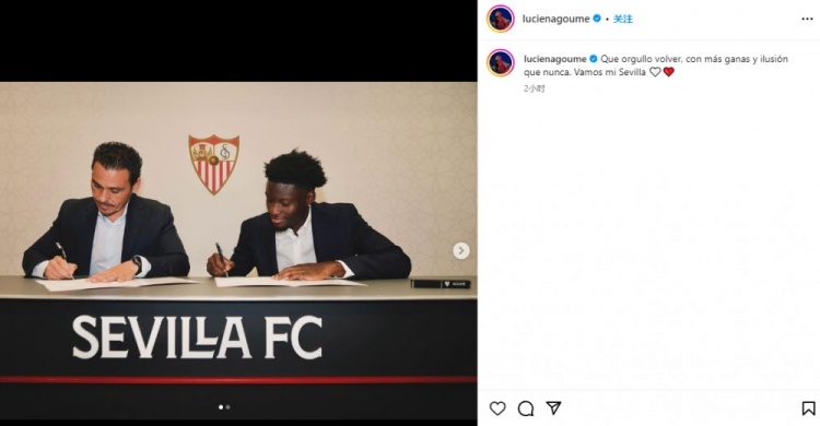阿古梅晒签约塞维利亚照:带着比以往更多的渴望和热情回归