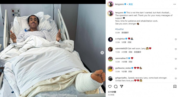 约罗晒出了自己躺在病床上的照片,可以看到他左脚缠着厚厚的绷带,而约罗本人则竖起两根大拇指以示情况良好。
