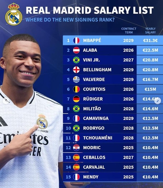 德转列皇马薪资榜:姆巴佩3130万欧,阿拉巴、维尼修斯、贝林前四