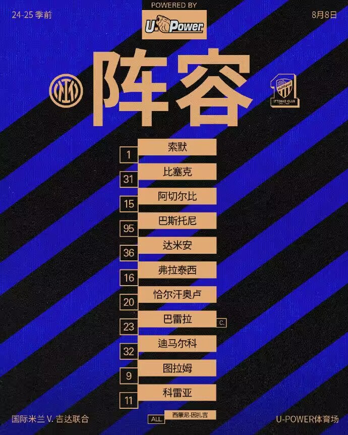 08月08日讯 季前友谊赛,国米vs吉达联合比赛即将打响。赛前首发出炉。国米首发:1-索默、31-比塞克、15-阿切尔比、95-巴斯托尼、36-达米安、16-弗拉泰西、20-
