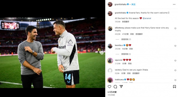 8月9日讯 勒沃库森在昨日热身赛客场1-4不敌阿森纳,前队长扎卡也重返酋长球场。扎卡也晒出了多张和阿尔特塔以及前队友互动的照片,并表示:“阿森纳球迷们,感谢