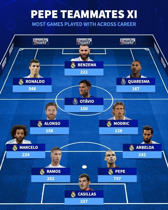 8月9日讯 41岁的葡萄牙老将佩佩宣布退役,《转会市场》也列出了和他一同出场次数最多的队友阵容,皇马队友霸榜。