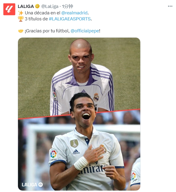 西甲官方致敬佩佩:皇马10年,3座西甲,感谢你带来的足球!