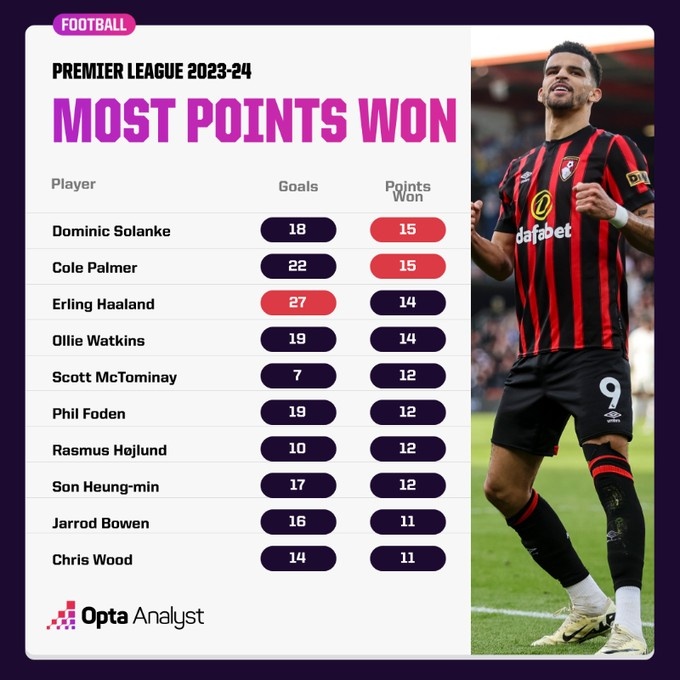 索兰克&帕尔默上赛季英超进球帮球队赢得15分,小麦7球12分