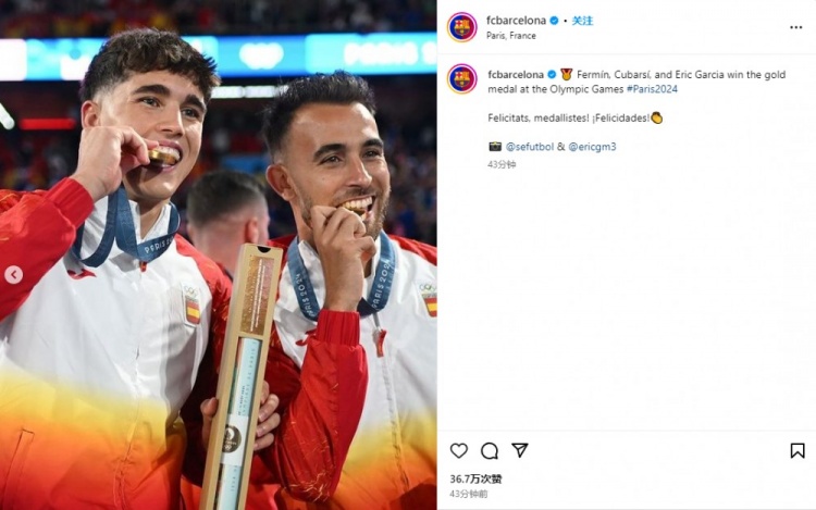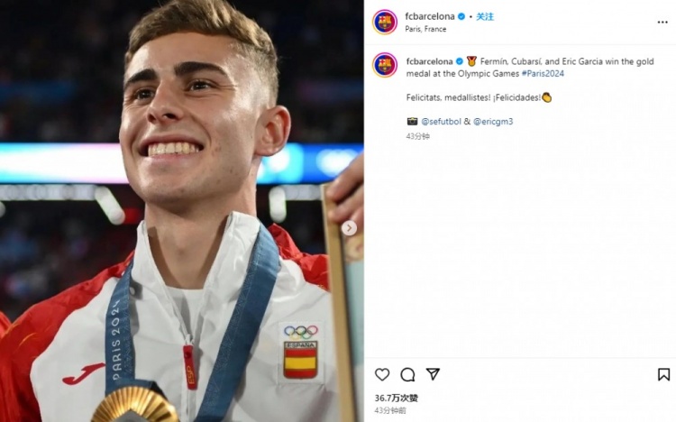 巴萨官方账号晒出自家球员佩戴金牌的照片:“费尔明、库巴西和加西亚赢得了奥运金牌。祝贺,金牌获得者们,祝贺你们!”