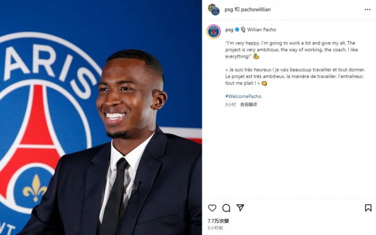 这位中卫也谈及自己加盟巴黎的感想:“我非常开心,我将会努力训练并竭尽全力。”