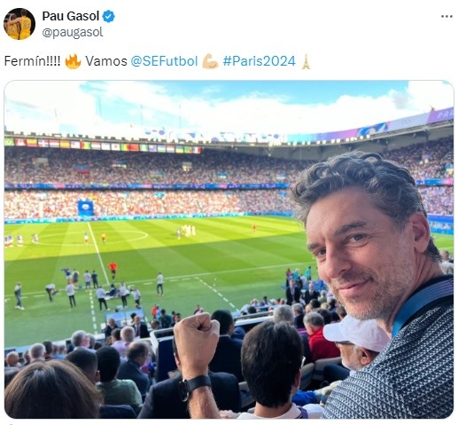 8月10日讯 西班牙在奥运男足决赛5-3加时击败法国,前湖人球星、现国际奥委会运动员委员会委员加索尔在今日现场观战。他也通过社媒发布了动态,先是发布了一张