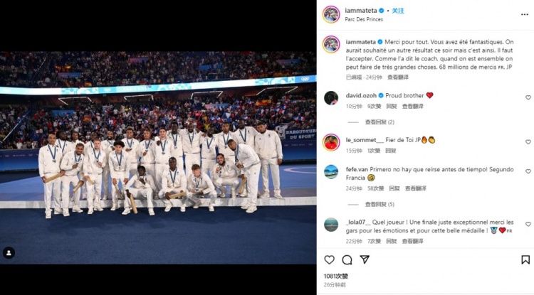 8月10日讯 法国在奥运男足决赛3-5不敌西班牙,在常规时间最后时刻点球绝平的马特塔赛后发文。