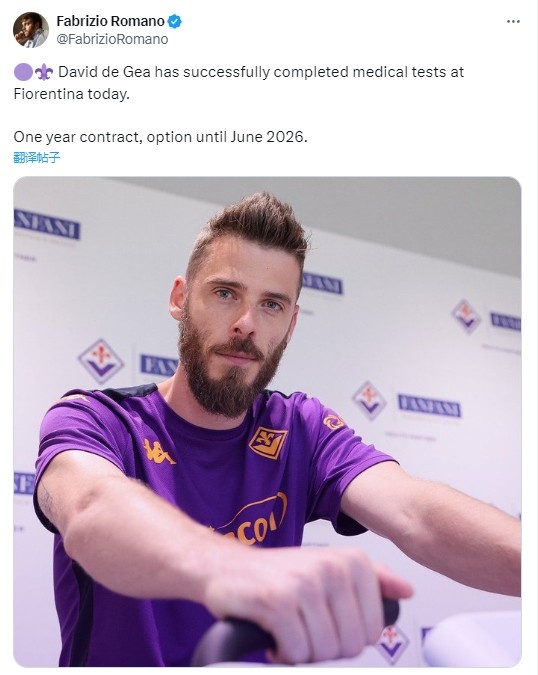 该记者透露:“德赫亚已经通过体检,他将和佛罗伦萨签下1年合同,并附带续约1年的条款。”