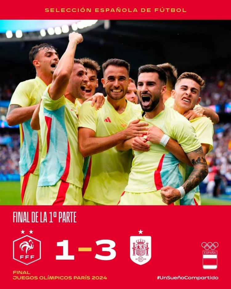 8月10日讯 北京时间8月10日0点,奥运男足金牌赛,法国对阵西班牙。上半场,特纳斯扑救失误,米洛特射门得分,费尔明连进两球反超比分,巴埃纳任意球直接破门。上半场比赛结束,法国1-3西班牙。