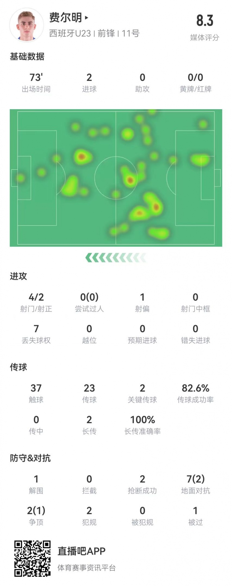换早了?费尔明本场数据:4射2正进2球+2关键传球 获评8.3分