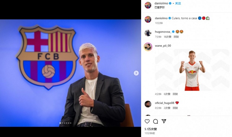 8月10日讯 巴萨已经官宣签下莱比锡中场奥尔莫,而这位西班牙国脚也通过社媒晒照纪念。