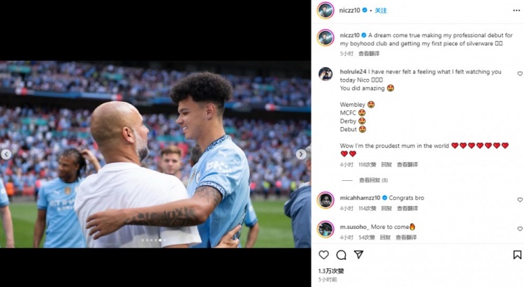 而本场比赛甚至是奥赖利在曼城一线队的首秀,他也配文道:“梦想成真。我为自己儿时支持的俱乐部完成职业生涯首秀,并赢得了我的首个冠军。”