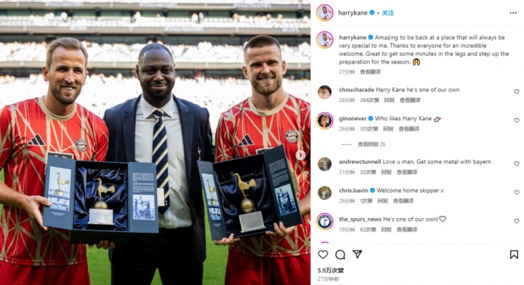 8月11日讯 拜仁在热身赛3-2客场击败热刺,重返白鹿巷的凯恩也通过社媒纪念。