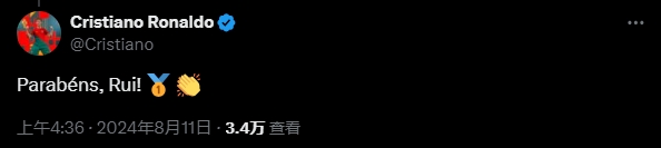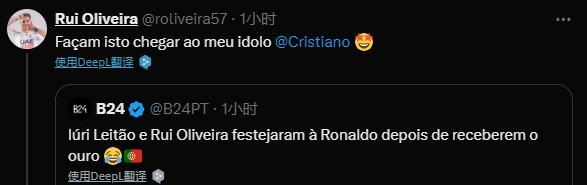 鲁伊-奥利维拉赛后更新社媒,晒出庆祝图片,配文:献给我的偶像,C罗。C罗也在这条动态下回复:恭喜你,鲁伊。