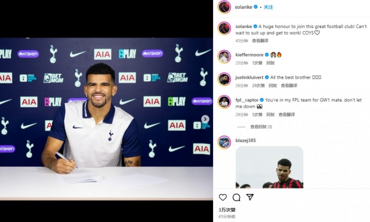 索兰克社媒:感谢伯恩茅斯 很荣幸加盟热刺这样伟大的俱乐部