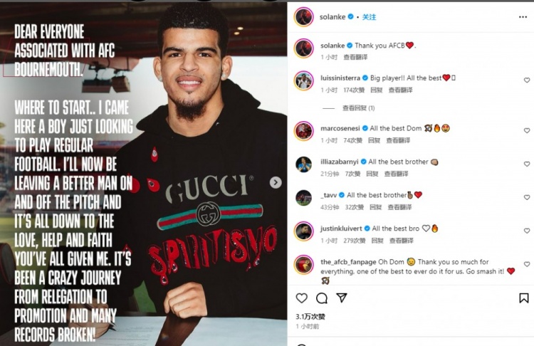 索兰克通过社媒发文:“感谢伯恩茅斯。致和伯恩茅斯相关的所有人:我不知从何说起,我来到这里时只是个想要获得常规轮换出场机会的男孩,现在则将作为一个在场上场下都更成熟的男人离开。这都要归功于你们给我的爱、帮助和信任。从降级到升级这段经历真的很疯狂,我们这一路还创造了很多纪录!”