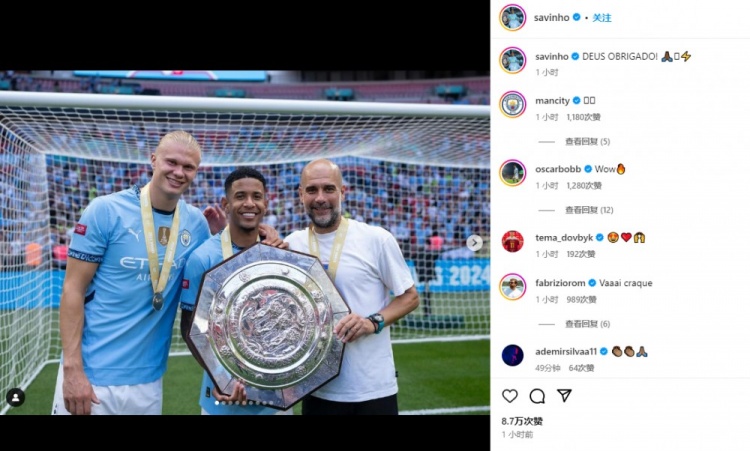8月11日讯 曼城在社区盾点球击败曼联,得以拿下新赛季首冠。今夏正式加盟的巴西20岁边锋萨维奥替补登场表现不俗,也在处子秀夺得个人曼城首冠。他也通过社媒