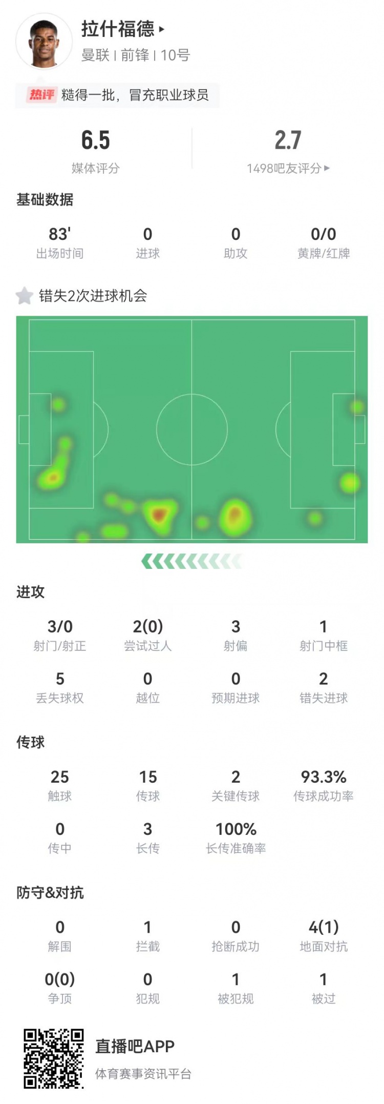 拉什福德2关键传球+3射门0射正 1中框+2错失重大机会 获评6.5分