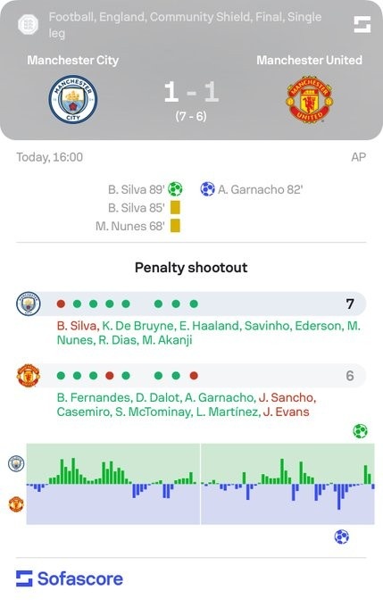 8月11日讯 曼城在社区盾点球击败曼联,得以赢得新赛季首冠。全场关键数据如下: