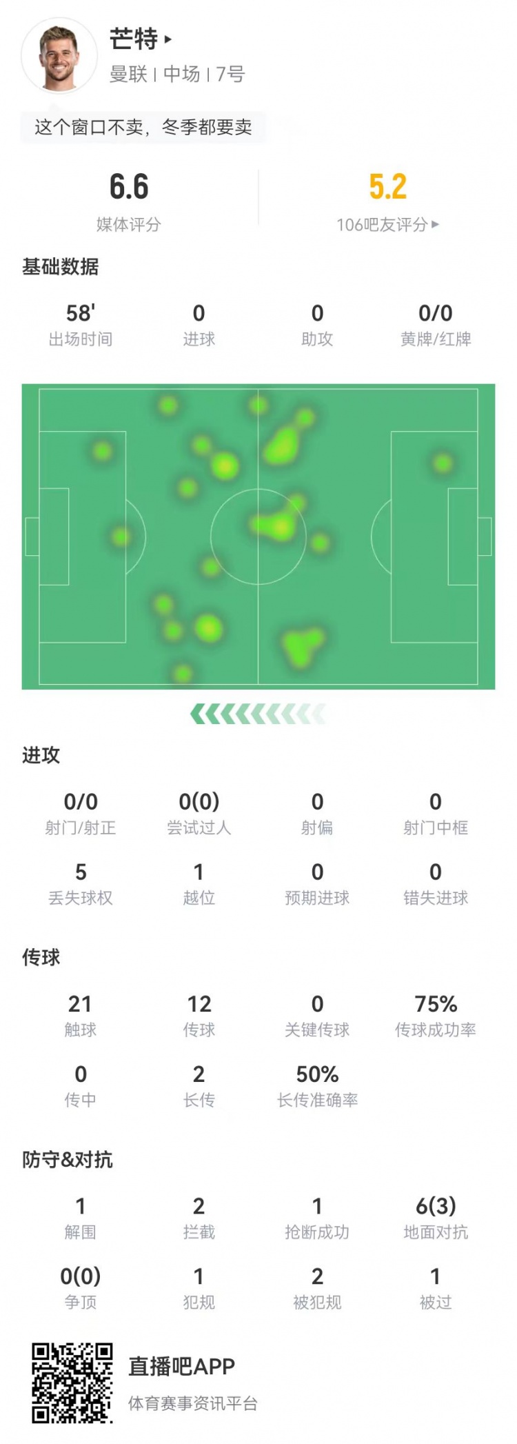 芒特本场数据:0射0关键传球,12传球9成功 获评6.6分